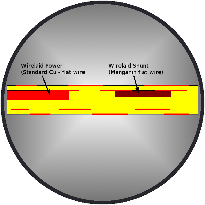 In the printed circuit board integrated Current Sense Resistors replace the discrete component. The otherwise customary in Wirelaid copper flat wires are replaced by flat wires of resistance wire with a very low temperature coefficient.
